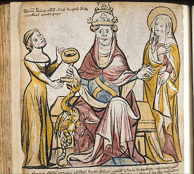 | Marozja (po lewej) i jej matka Teodora (po prawej) skutecznie manipulowały papieżami w okresie pornokracji. Ilustracja z XIII-wiecznej księgi Marcina z Opawy.  |